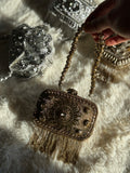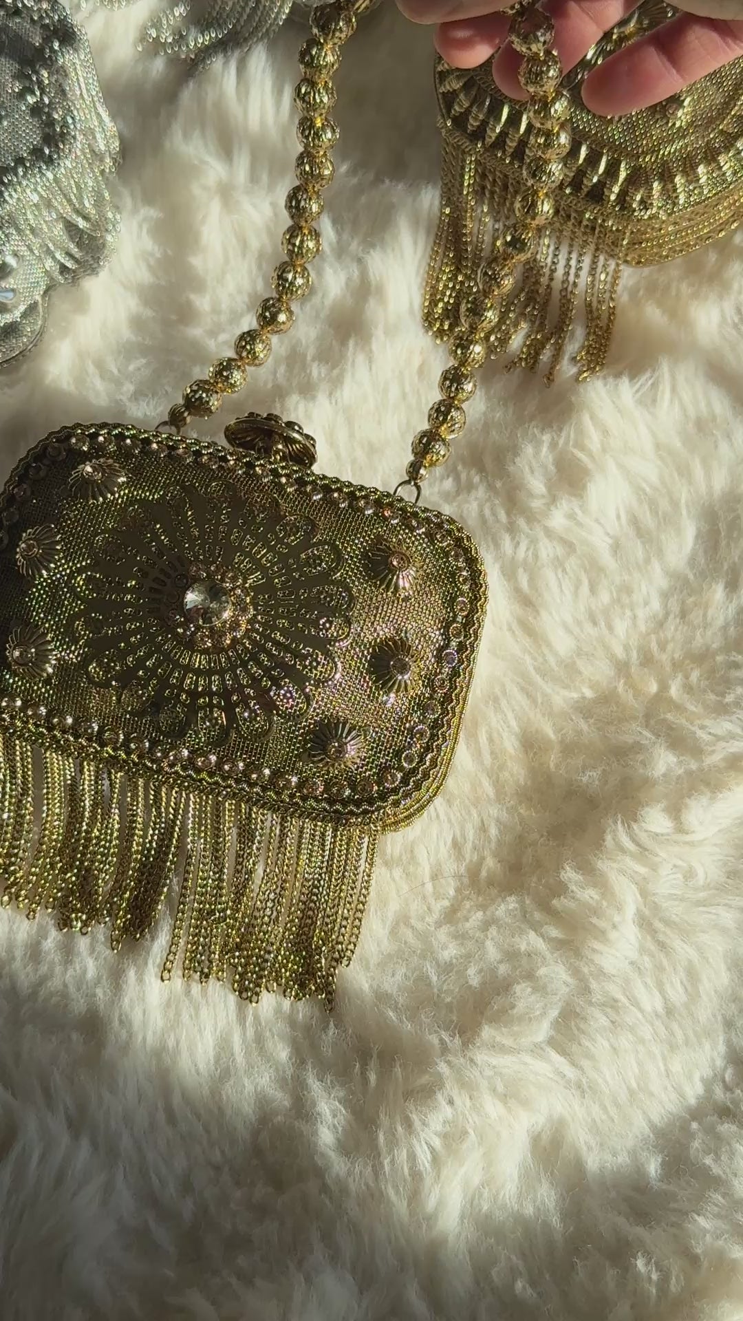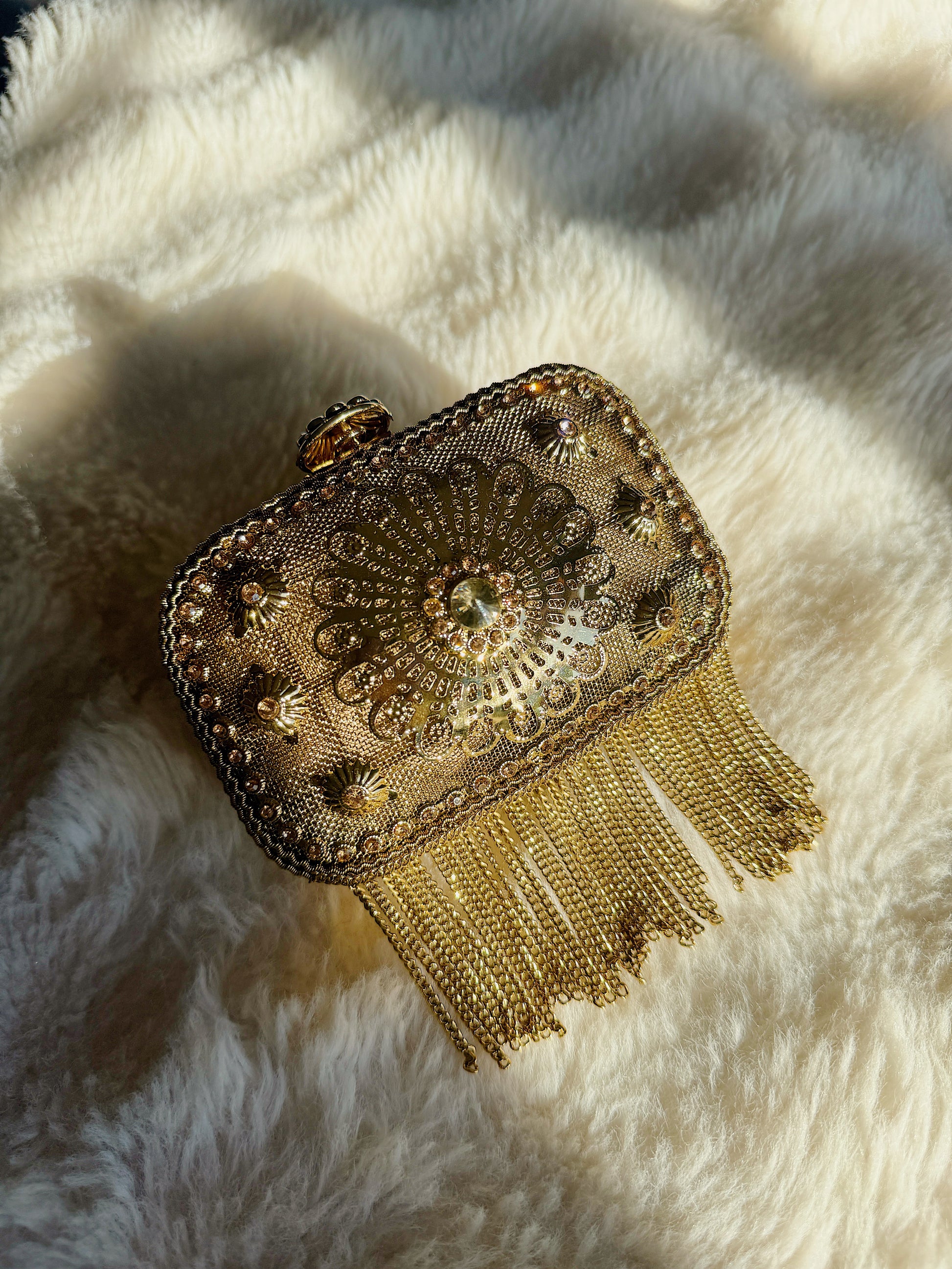 This Gold mini clutch features hand-crafted embellishments, including tassels and beaded handles for a unique and stylish touch.