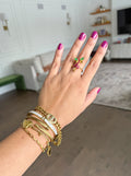 This waterproof gold plated stacked set includes four unique bracelets for a versatile and stylish addition to any outfit. With its durable design, these pieces are perfect for everyday wear. Elevate your look with this stunning 4 piece stacked set.