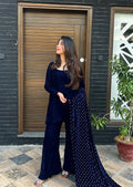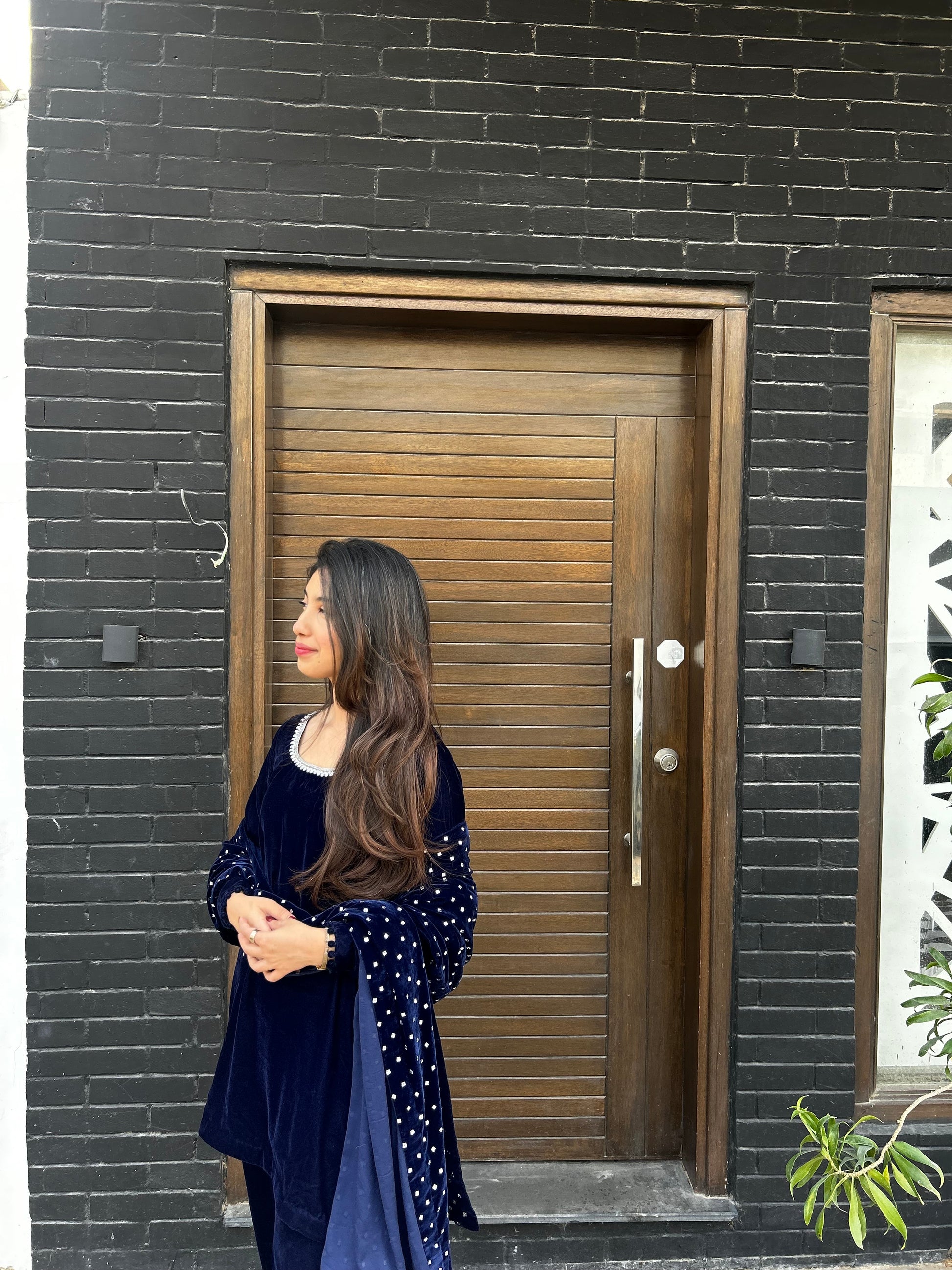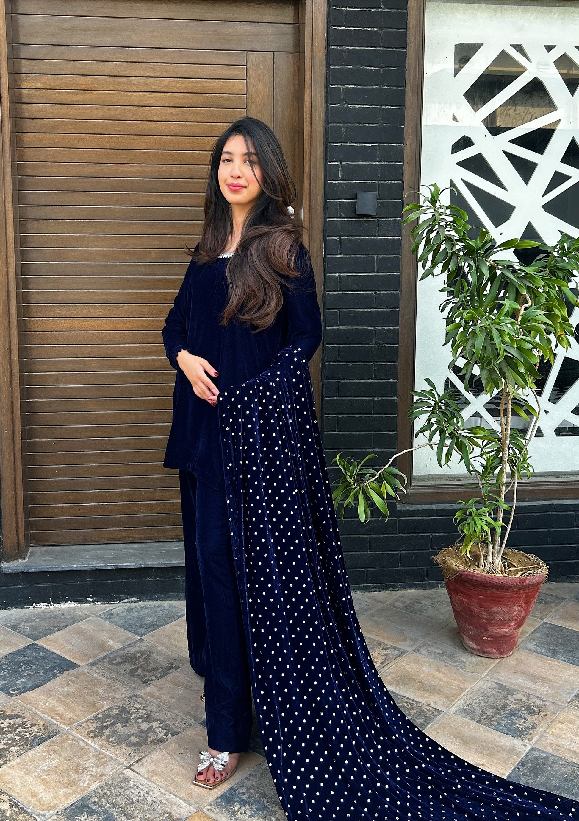 Delivery by End of feb if order is placed by January 30th Elevate your style with Kiara, a stunning navy blue velvet three-piece set. This trendy co-ord features a luxurious two-piece ensemble adorned with sparkling stones at the neckline, paired with a matching stone-studded velvet shawl. Perfect for special occasions or upscale events, this sophisticated set combines comfort with glamorous detail. Pls refer to size chart below: